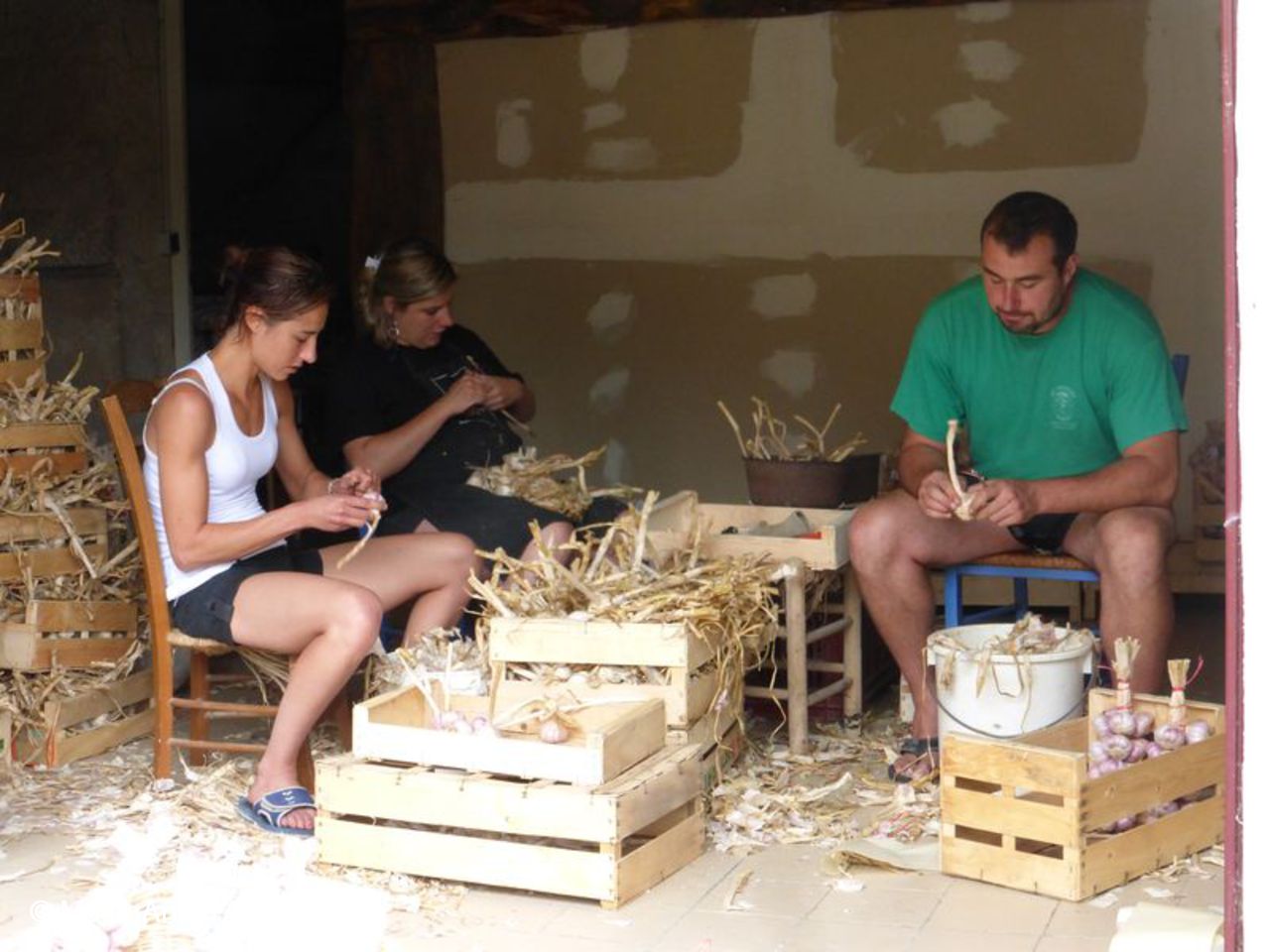 4 août - préparation des bouquets d'ail rose pour la vente, à Lautrec